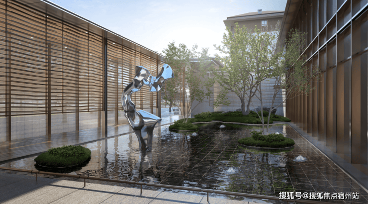 水作为贯穿兴云间整座园区最重要的元素之一,主进口处的水景雕塑《晓风艺墅》具有至关重要的位置,金属的光泽与水光的灵动交相辉映,成为空间中的点睛之笔。